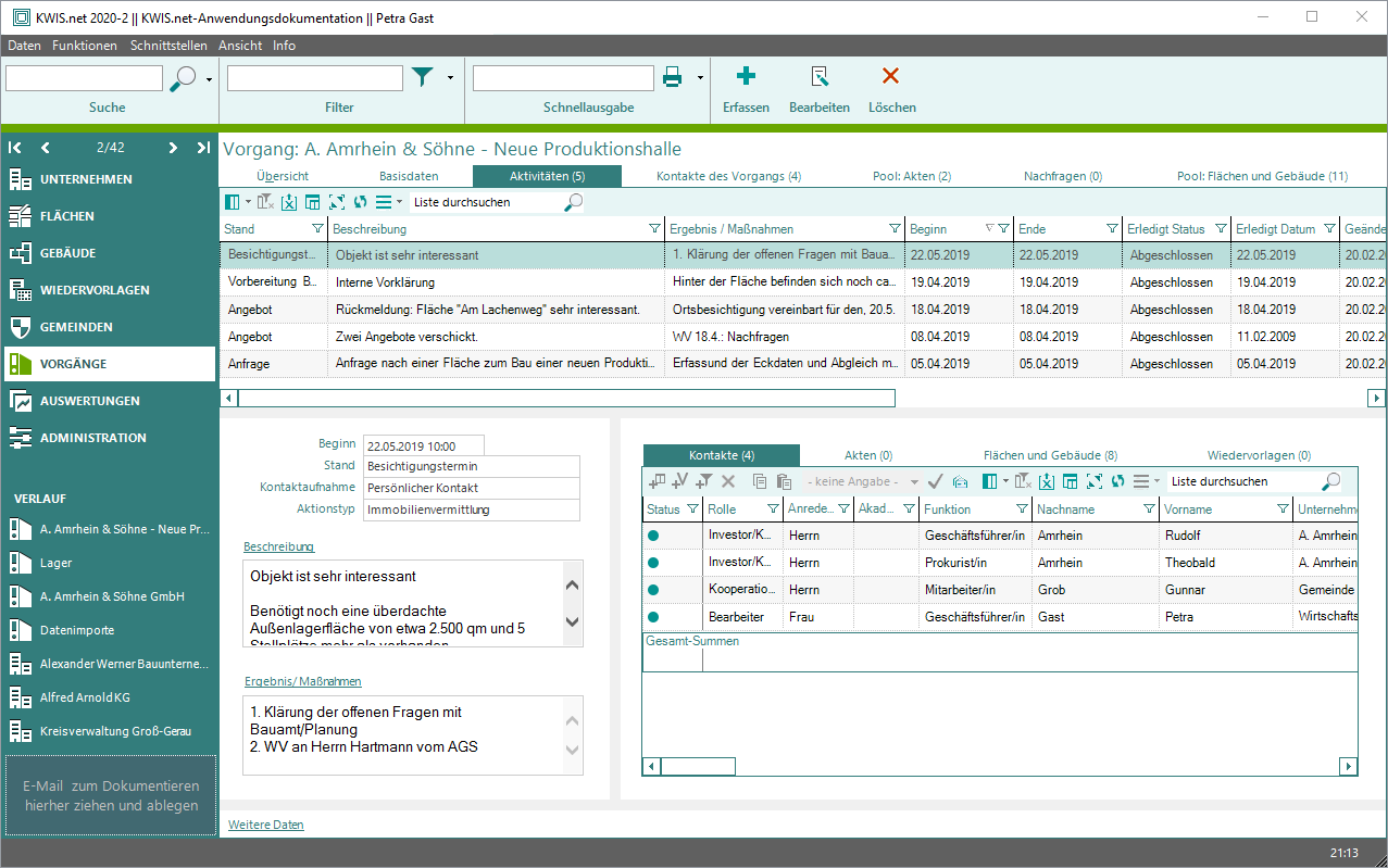 Der weitere Verlauf bis zu einem Vertragsabschluss wird in gleicher Weise dokumentiert, in dem die einzelnen Arbeitsschritte als Aktivitäten in KWIS gespeichert werden.