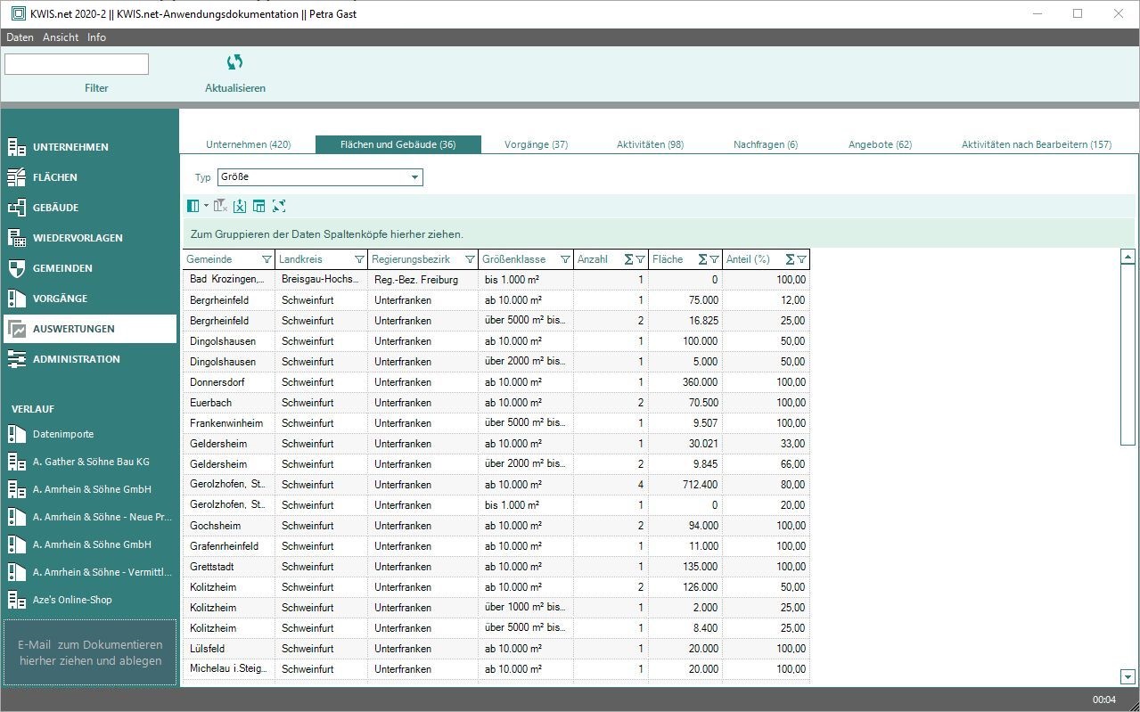 Hier können Sie zu den Modulen "Unternehmen", "Flächen und Gebäude", "Vorgänge" und zu den Reitern "Aktivitäten", (Immobilien-)"Nachfragen" und (Immobilien-)"Angebote" Auswertungen erstellen. Sie können die Daten in KWIS.net auf einfache Weise nach verschiedenen Kategorien gruppieren. Es stehen Ihnen hier alle Filter zur Verfügung die für die Schnellausgabe freigegeben sind ==> siehe Filter.