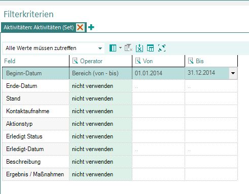 In der Beschreibung zu den einzelnen Kriterien finden Sie zu dem Kriterium "Aktivitäten (Set)" unter anderem das Beginn-Datum und das Ende-Datum. Dies sind die relevanten Kriterien für unser Filterbeispiel. Mit Doppelklick auf dieses Kriterium schließt sich das Auswahlfenster. Sie können nun die Werte bestimmen, die die für Ihr Filterziel relevanten Kriterien annehmen sollen. Benutzen Sie dazu den Operator "Bereich (von- bis)" um das "Beginn-Datum" und "Ende-Datum" abzufragen (nutzen Sie zur Eingabe der Datumsangaben die Kalenderfunktion durch Klick auf das KlapplistensymbolKlapplistenpfeil ).