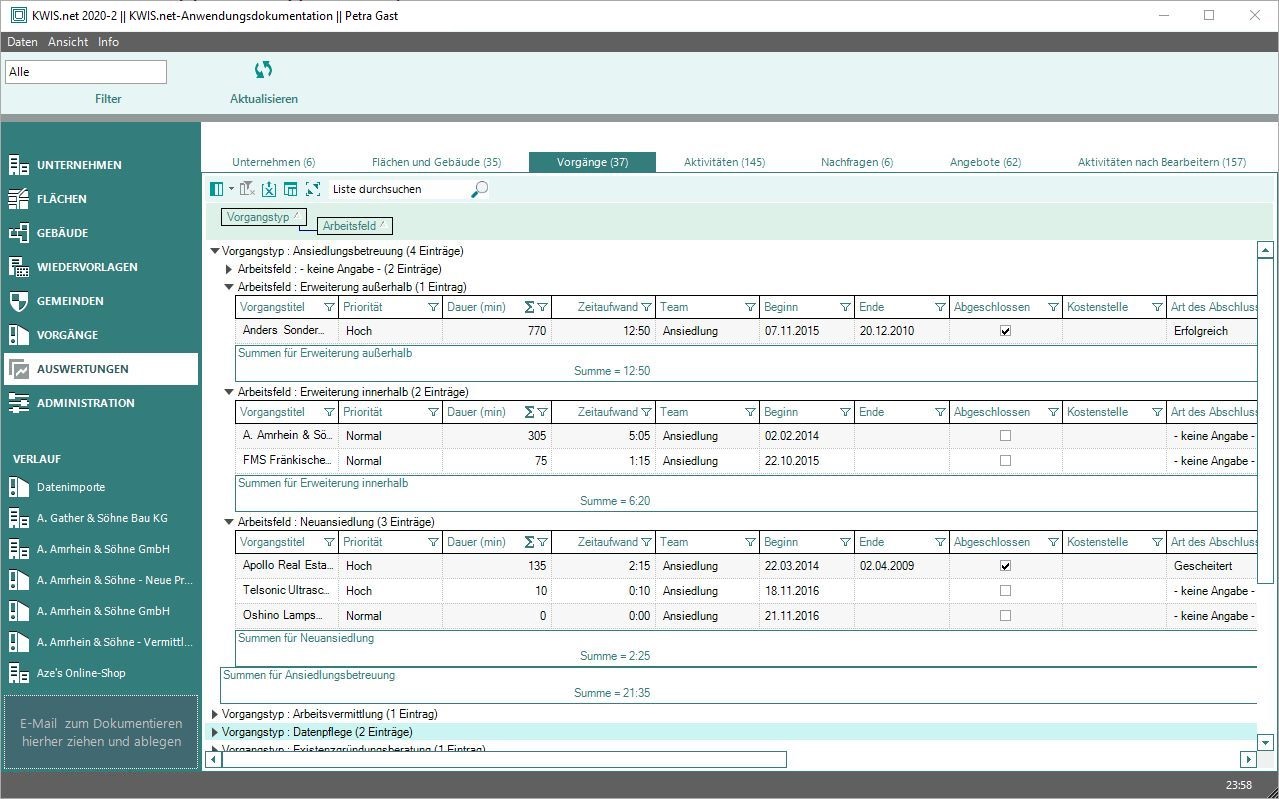 Auswertungen über Vorgänge
