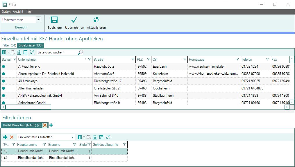 8.Wenn Sie das Filterergebnis auf den Übersichtsreiter des Unternehmensmoduls übernehmen möchten, betätigen Sie in der Symbolleiste den Übernehmen-Button