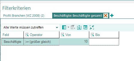 6.Fügen Sie nun über den Plus-Button in der Reiterzeile ein weiteres Kriterium "Beschäftigte gesamt" hinzu und geben Sie im Wertebereich (linker unterer Fensterbereich) im Feld "Operator" "größer gleich" und im Feld "Von" "10" ein.