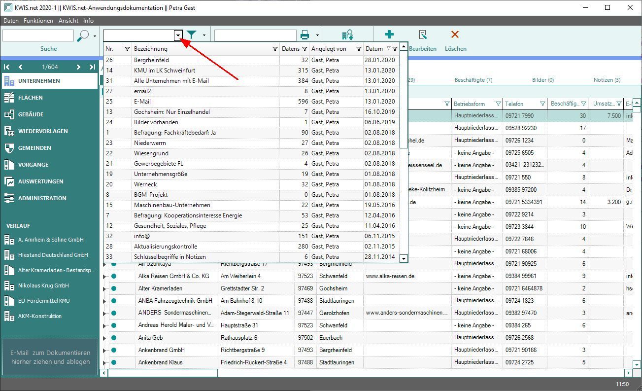 Zusätzlich zum Spaltenfilter besteht eine umfassendere Filtermöglichkeit in den Modulen "Unternehmen", "Flächen", "Gebäude" und "Vorgänge". Angelegte Filter können Sie in den Übersichtsreitern der Module auswählen (s. Abbildung).