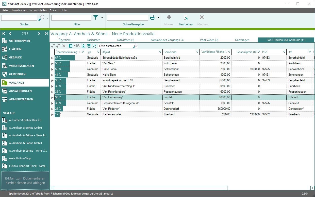 Haben Sie Ihre Nachfrage-Kriterien eingegeben, so wird Ihnen jede Immobilie für den "Pool: Flächen und Gebäude" vorgeschlagen, die nur eine Übereinstimmung aufweist (z.B. Erschließungskategorie "Autobahn" in maximal 2 km Entfernung).