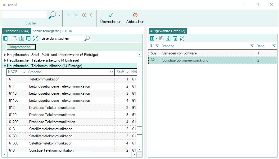Auf der linken Seite sehen Sie alle verfügbaren Branchen nach der Wirtschaftszweigsystematik der Europäischen Union (NACE-Code, entspricht den ersten Stellen des nationalen WZ-Codes) und auf der rechten Seite die bereits dem Unternehmen zugeordneten Branchen. Sie können sich in der umfangreichen Liste der verfügbaren Branchen auf drei Arten orientieren: