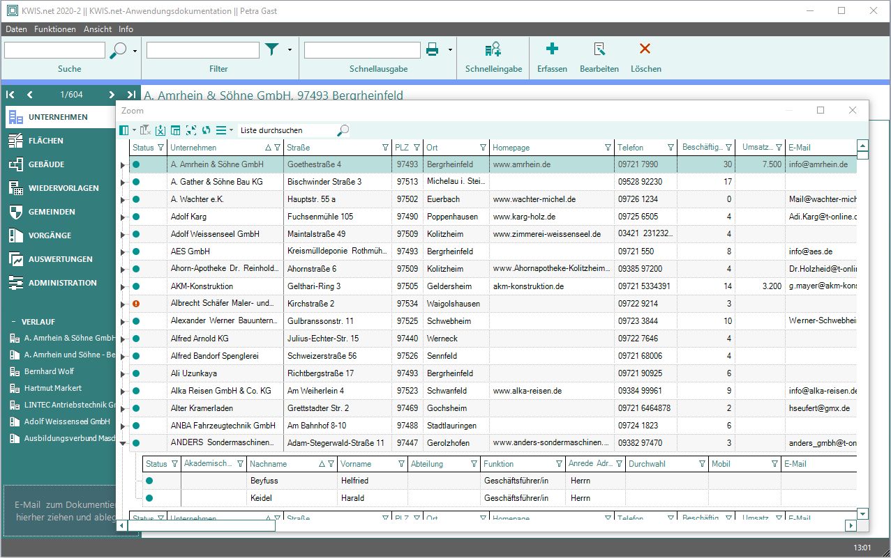 Sie können in einzelne Listenansichten und Freitextfelder hineinzoomen. Die betroffenen Felder werden hierzu aus der Bedienoberfläche ausgekoppelt und lassen sich vergrößert darstellen. Diese Funktion eignet sich besonders zum Überarbeiten von Daten an kleinen Monitoren. Sie können sie auch sinnvoll einsetzen, wenn Sie mit zwei Monitoren arbeiten und z.B. eine Listenansicht auf einen Bildschirm maximieren. Zusätzlich lässt sich mit der Tastenkombination Strg und + bzw. - die Schriftgröße verändern.