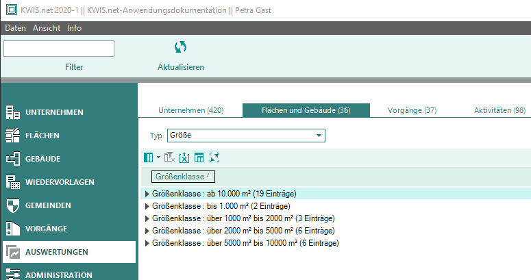 Hier können Sie zu den Modulen "Unternehmen", "Flächen und Gebäude", "Vorgänge" und zu den Reitern "Aktivitäten", (Immobilien-)"Nachfragen" und (Immobilien-)"Angebote" Auswertungen erstellen. Sie können die Daten in KWIS.net auf einfache Weise nach verschiedenen Kategorien gruppieren. Es stehen Ihnen hier alle Filter zur Verfügung die für die Schnellausgabe freigegeben sind ==> siehe Filter.