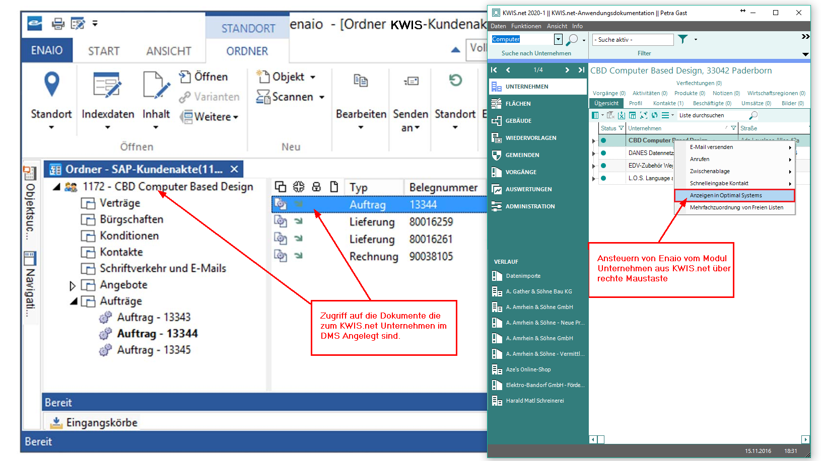 Die Schnittstelle beinhaltet die Möglichkeit, aus KWIS heraus den betreffenden "Unternehmensordner" in OS|ECM zu öffnen. Damit haben Sie direkt aus KWIS heraus z.B. über die rechte Maustaste einen schnellen Zugriff auf alle Dokumente, die beim Unternehmen „abgelegt“ sind. Sie müssen nicht in zwei Systemen das gleiche Unternehmen suchen: