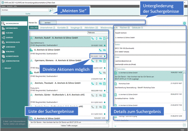 Die bereichsübergreifende Suche ermöglicht es Ihnen, schnell und einfach auf alle Ihre Daten zuzugreifen, Details zu Suchergebnissen einzusehen und direkt daraus weitere Aktionen zu starten – z. B. Anrufe tätigen oder E-Mails verfassen.